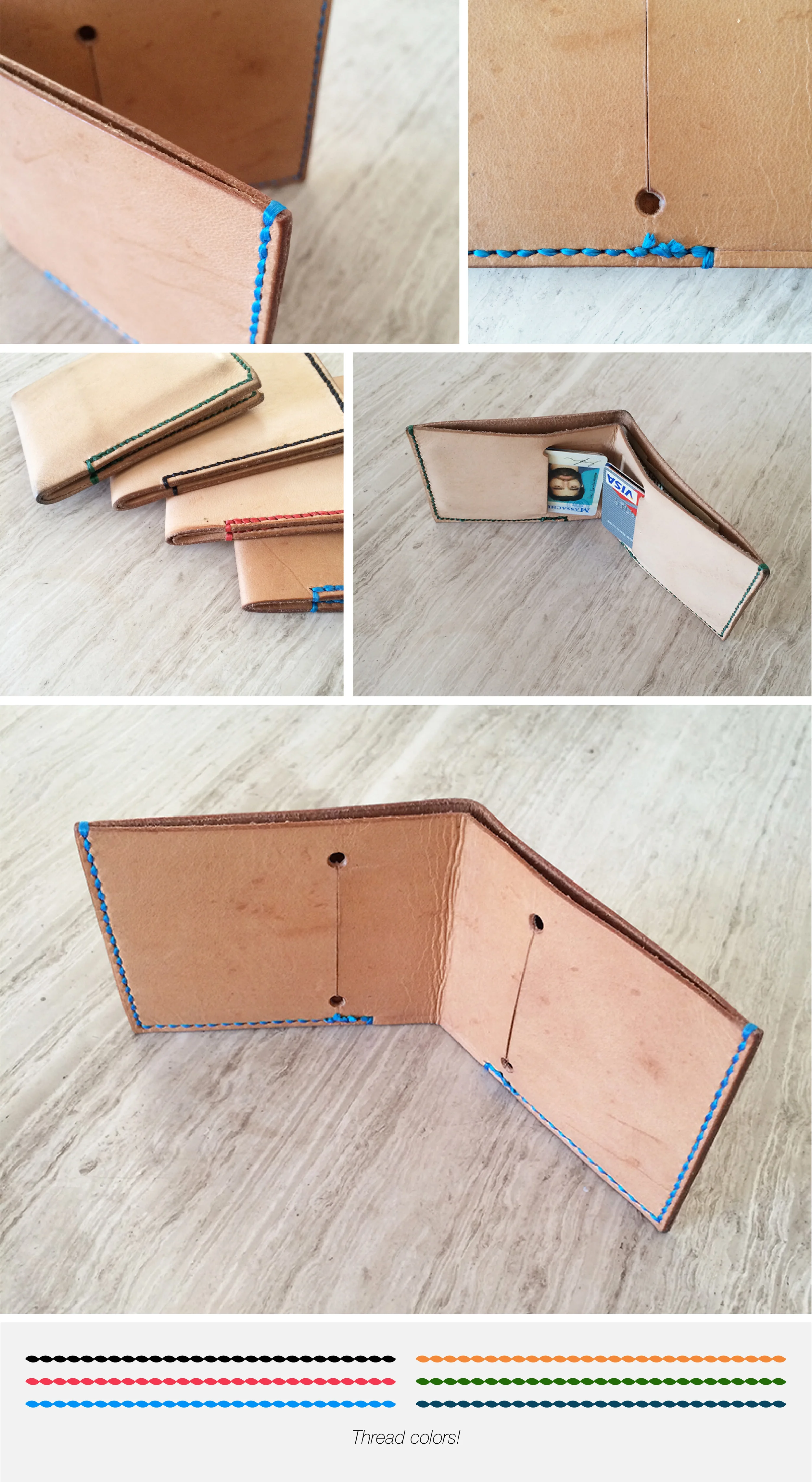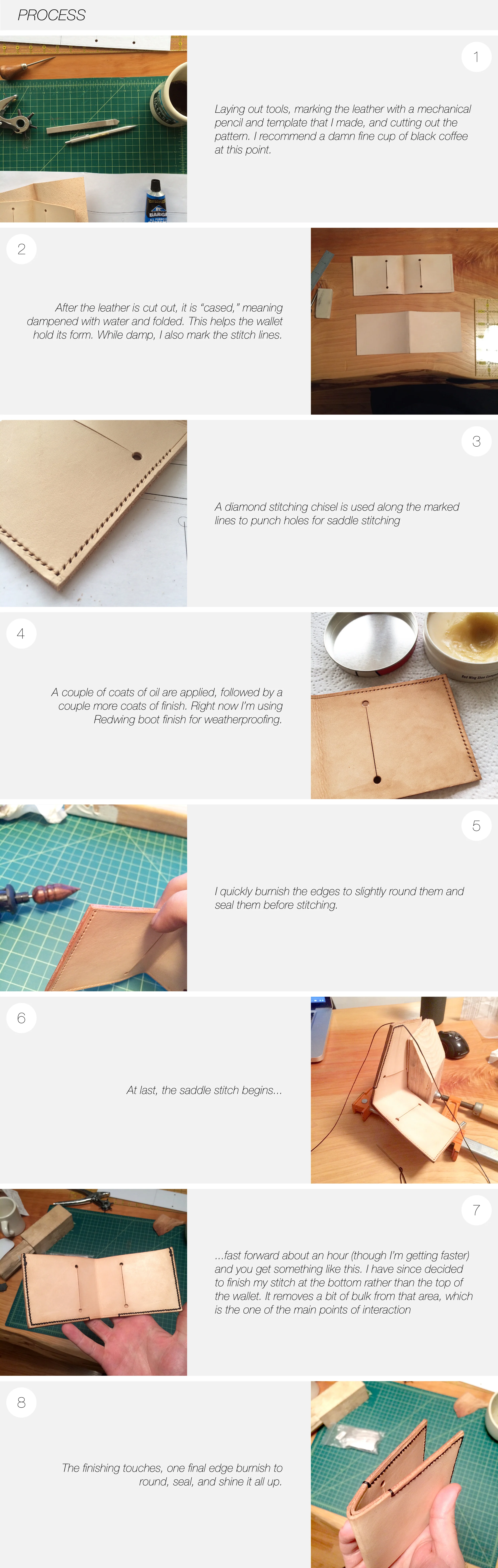 Although simple in form, I consider this wallet, and leather working in general, a work in progress. In it's current iteration, the 2-Ply is made from oiled and top coated vegetable tanned leather. The stitching has progressed from a sewing awl to a more traditional two-needle saddle stitch. The saddle stitch falls in line with traditional leather construction, and creates a seam that is more consistent in appearance, stronger, easier to repair, and more aesthetically pleasing. The outer edges and credit card cutouts are burnished to a gloss finish, which seals the leather and prevents fraying.